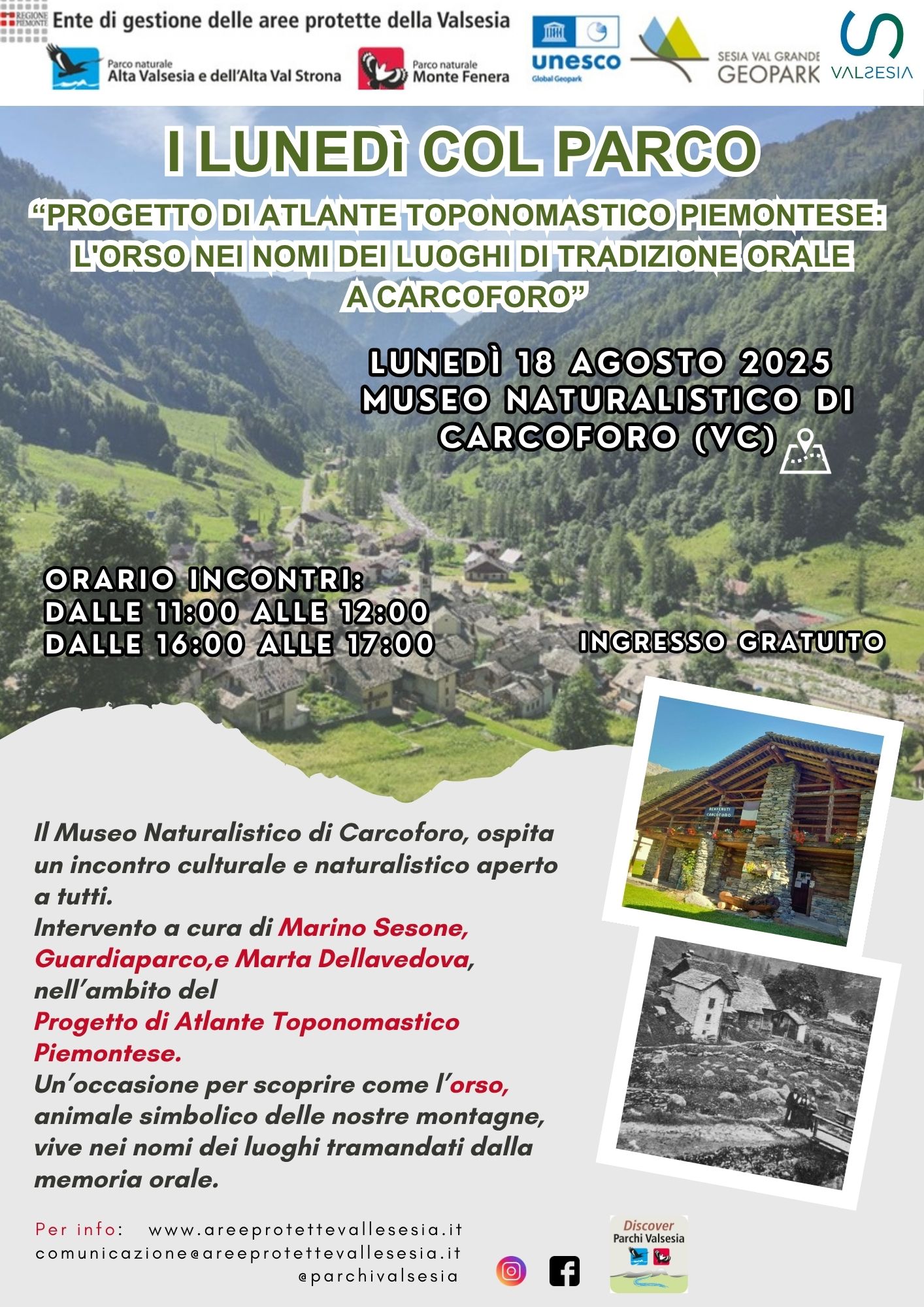 Lunedì 18 agosto – "PROGETTO DI ATLANTE TOPONOMASTICO PIEMONTESE: L'ORSO NEI NOMI DEI LUOGHI DI TRADIZIONE ORALE A CARCOFORO"