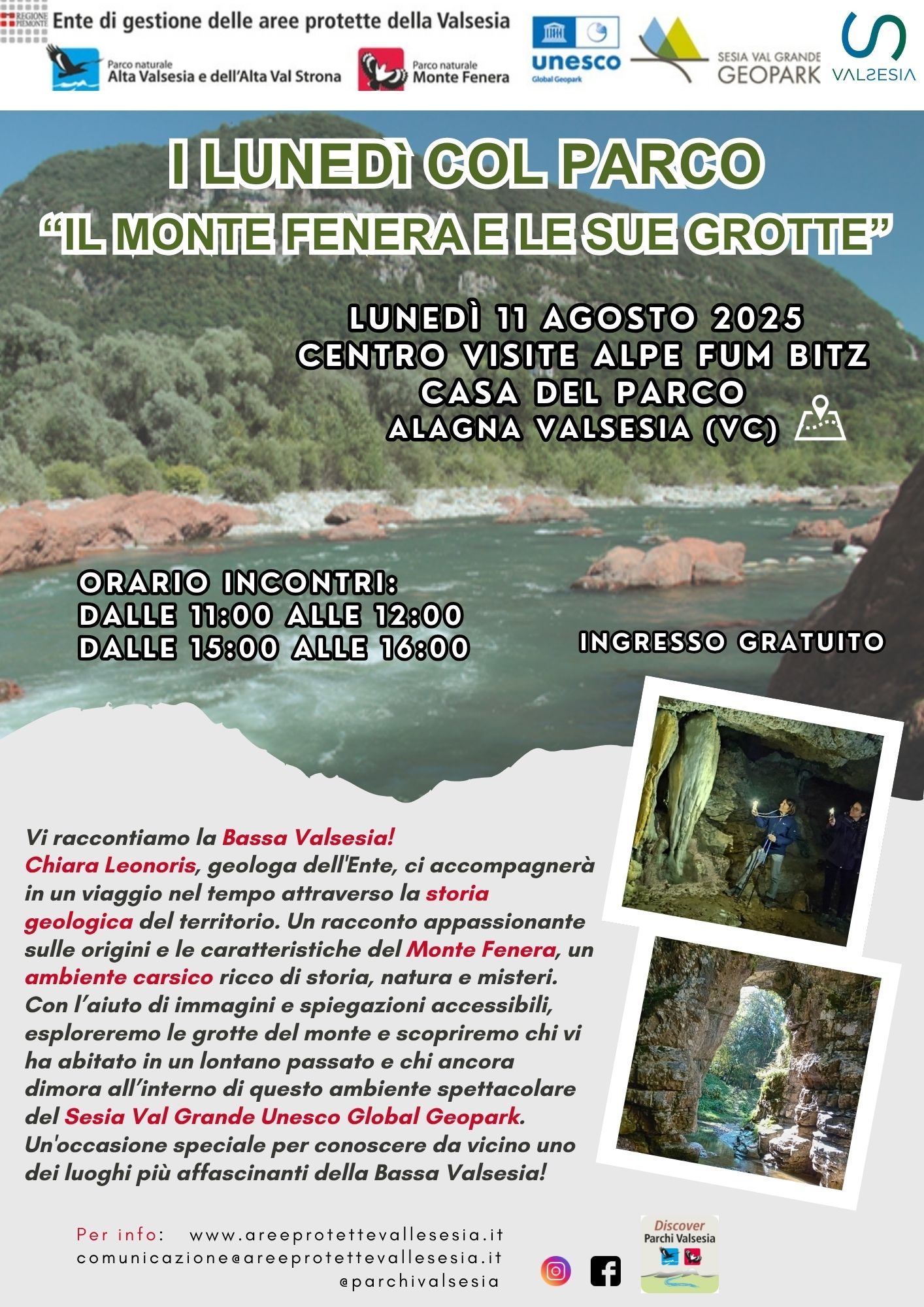 Vi raccontiamo la Bassa Valsesia! Chiara ci accompagnerà in un viaggio nel tempo attraverso la storia geologica del territorio. Un racconto appassionante sulle origini e le caratteristiche del Monte Fenera, un ambiente carsico ricco di storia, natura e misteri. Con l’aiuto di immagini e spiegazioni accessibili, esploreremo le grotte del monte e scopriremo chi vi ha abitato in un lontano passato e chi ancora dimora all’interno di questo ambiente spettacolare del Sesia Val Grande Unesco Global Geopark.