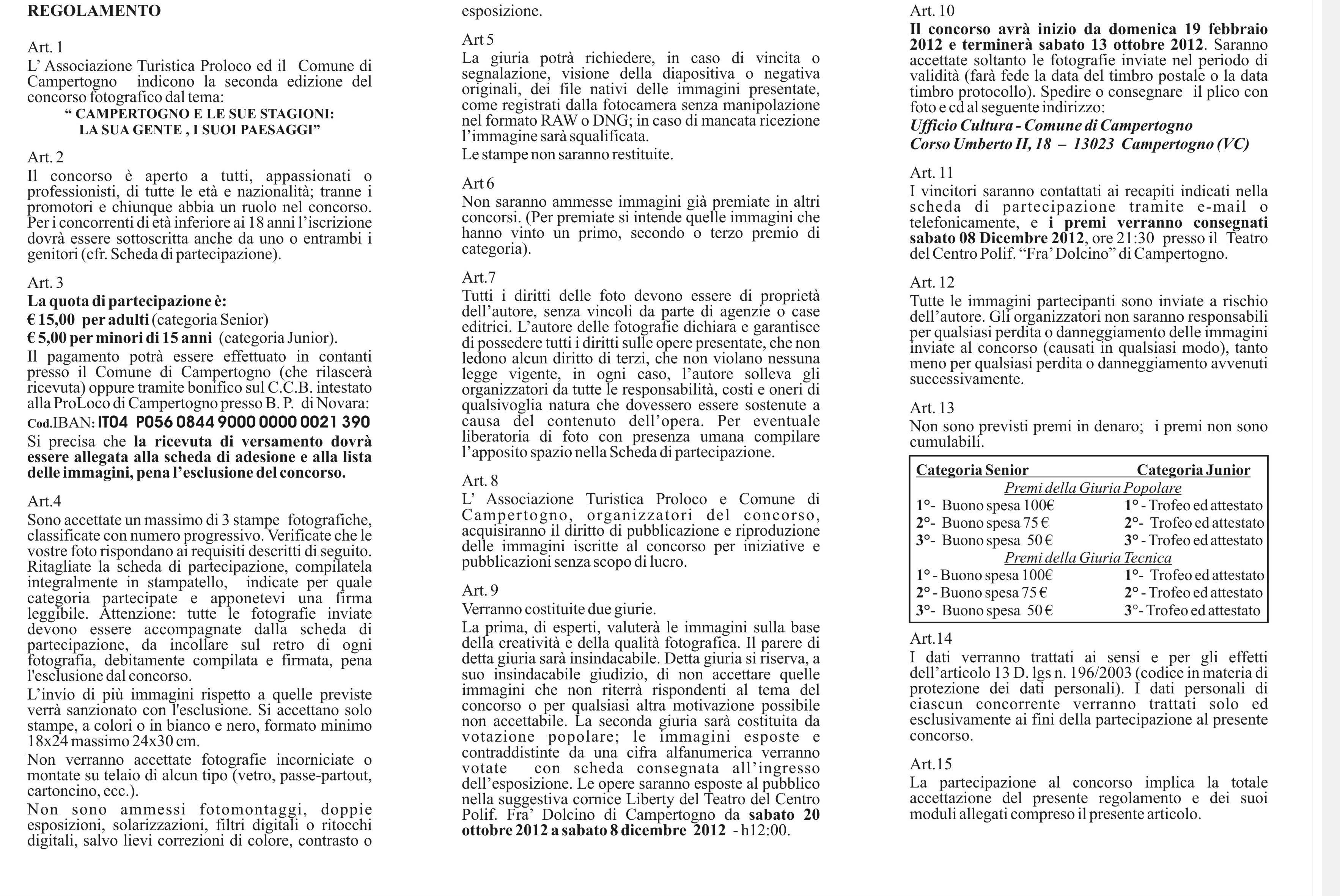 L'Associazione Turistica PRO LOCO di CAMPERTOGNO e l'Amministrazione Comunale di CAMPERTOGNO hanno organizzano la 2° Edizione del CONCORSO FOTOGRAFICO avente come UNICO TEMA " CAMPERTOGNO e le SUE STAGIONI: la SUA GENTE, i SUOI PAESAGGI" articolato in 2 Sezioni: