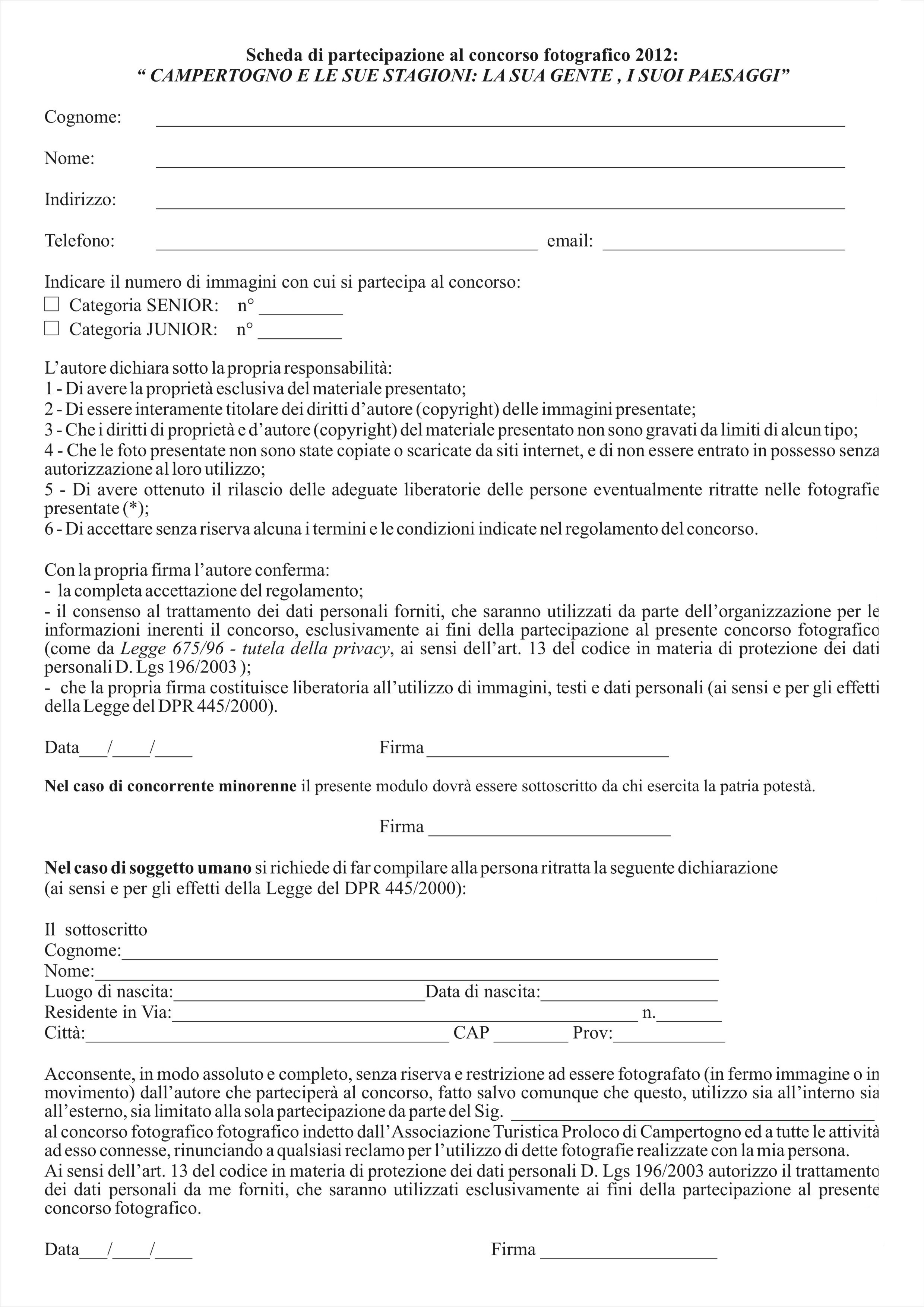 Si ricorda all'allegato REGOLAMENTO del CONCORSO FOTOGRAFICO Edizione 2012 per ulteriori ragguagli ed informazioni.