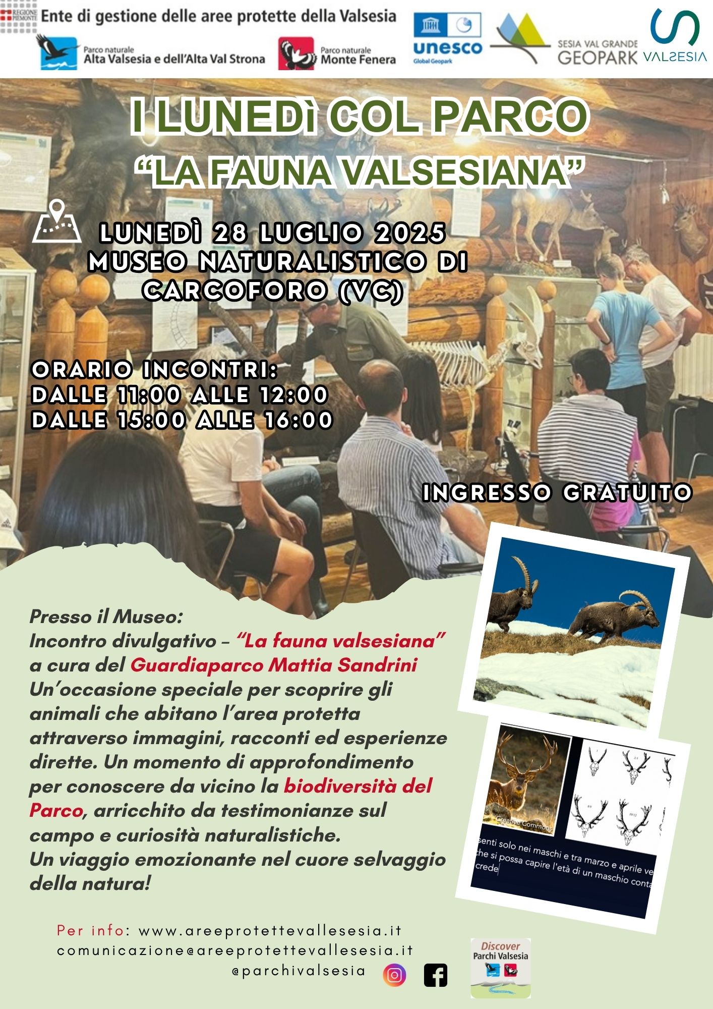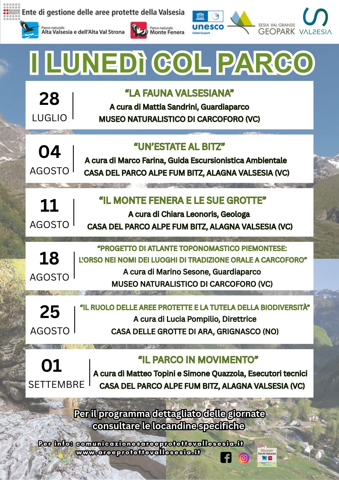 L’Ente di gestione delle Aree protette della Valsesia – che dal 2012 tutela e valorizza il Parco Naturale Alta Valsesia e Alta Valstrona e il Parco Naturale del Monte Fenera – organizza sei giornate, ciascuna articolata in due incontri (uno al mattino e uno al pomeriggio), per far scoprire le meraviglie delle Aree Protette. Gli appuntamenti si svolgeranno nei tre Centri Visite di proprietà dell'Ente e saranno animati dalle voci appassionate dello staff: dai Guardiaparco agli operatori tecnici, da una Guida Ufficiale a una Geologa, fino alla Direttrice dell'Ente.