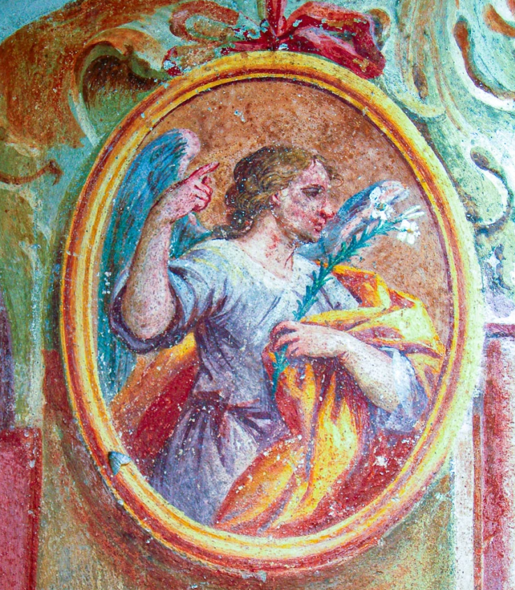 All'interno, nella parete di fondo, è conservato un affresco raffigurante, entro una cornice pittorica di color rosso antico, la Madonna in trono e il Bambino con la collana ed un santo benedicente dal volto male ridipinto (S. Gaudenzio?).