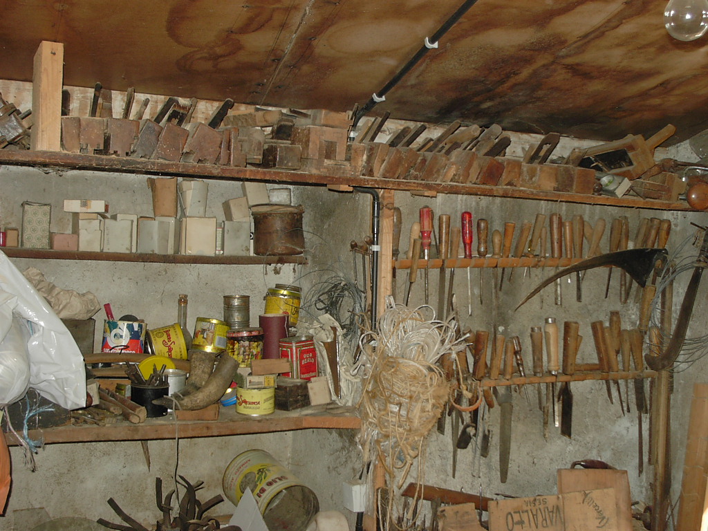 Le pareti sono spesso dotate di scaffali e rastrelliere dove sono ordinatamente disposti i vari utensili e materiali, come viti, chiodi, colle e vernici. Una mola per affilare le lame e gli strumenti da taglio è anch'essa presente.