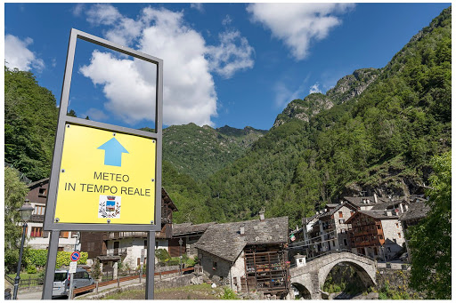Simpatico cartello istallato nel 2019 in cui nel riquadro superiore si possono vedere in tempo reale le condizioni meteo .