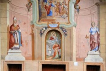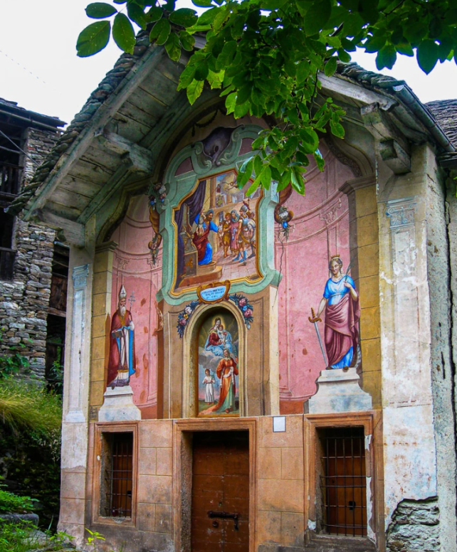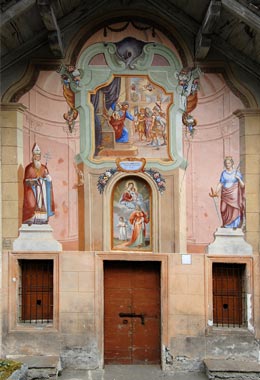 L’Oratorio di San Quirico risale al 1590, mentre gli affreschi sulla facciata, così come la vediamo oggi sono stati realizzati in epoche diverse. Le immagini della parte superiore dell’edificio rappresentano il martirio di San Quirico. L’affresco centrale ritrae la Madonna con il Bambino, San Quirico fanciullo e la madre Giuditta ed è del 1823. Il ritratto di Sant’Ambrogio che si vede sulla sinistra è datato 1865, a destra, invece Santa Barbara. L’interno conserva una altare con quattro colonne a spirale, a lato ecco la Cappella di Sant’Ambrogio.