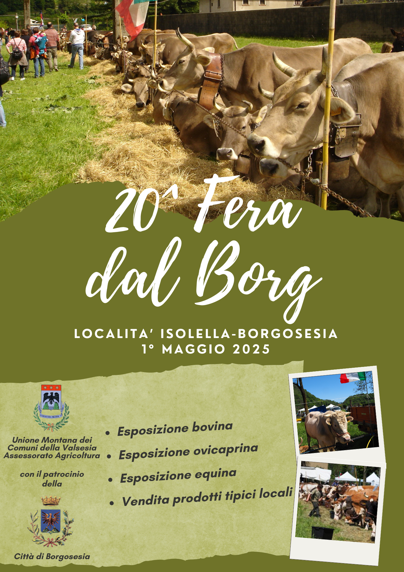 La 20^ Fera dal Borg, manifestazione zootecnica con esposizione Bovina, Equina e Ovicaprina presso Isolella di Borgosesia organizzata dall'Unione Montana dei Comuni della Valsesia con il patrocinio del Comune di Borgosesia si terrà il 1° maggio 2025