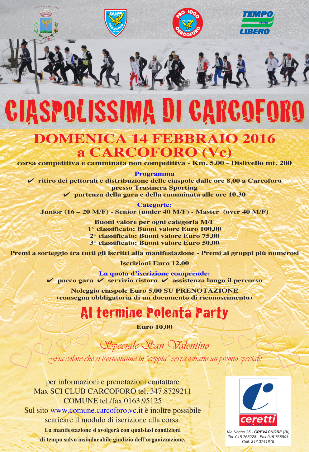 Corsa Competitiva e Camminata non competitiva di km. 5 e Dislivello 200 mt ca. con ristoro. Al termine tutti insieme presso il Centro Sci club per il Pranzo e a seguire le premiazioni di Classifica e premi a sorteggio per tutti.