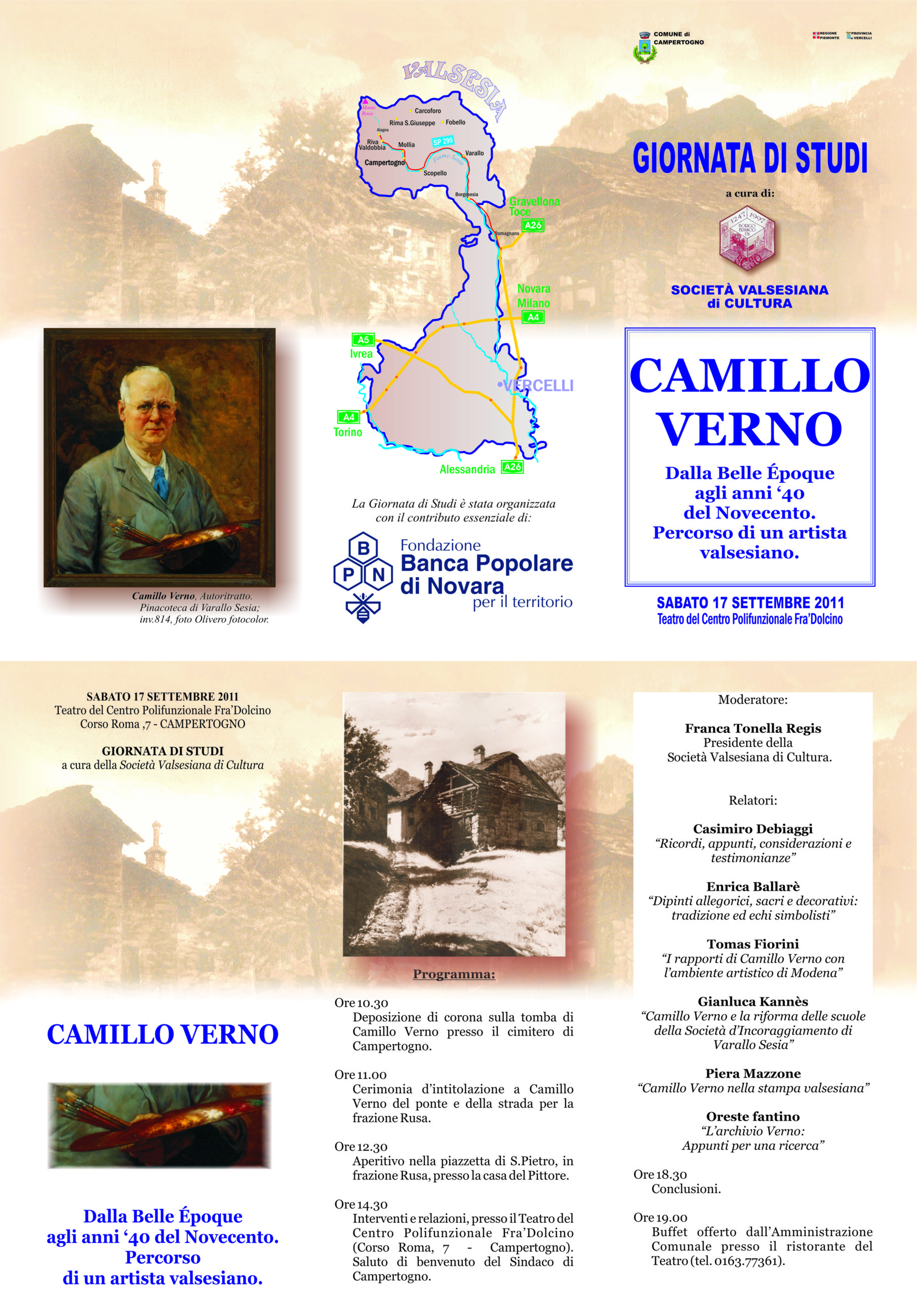 L'Amministrazione Comunale in collaborazione con la Società Valsesiana di Cultura organizza la giornata di studi sul celeberrimo pittore Camillo VERNO in data Sabato 17/09/2011 secondo il seguente programma: